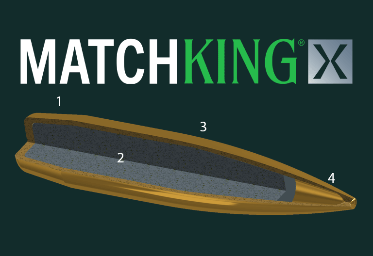 Engineered with a unique draw-and-trim process, MatchKing X features a thick copper jacket through the body for enhanced durability while a tapered design at the mouth ensures reliable and devastating expansion.